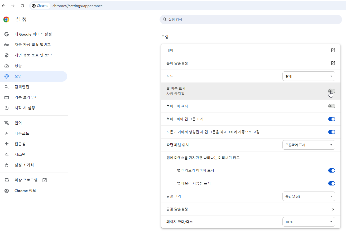 - 오른쪽에서 [홈 버튼 표시]를 찾아서